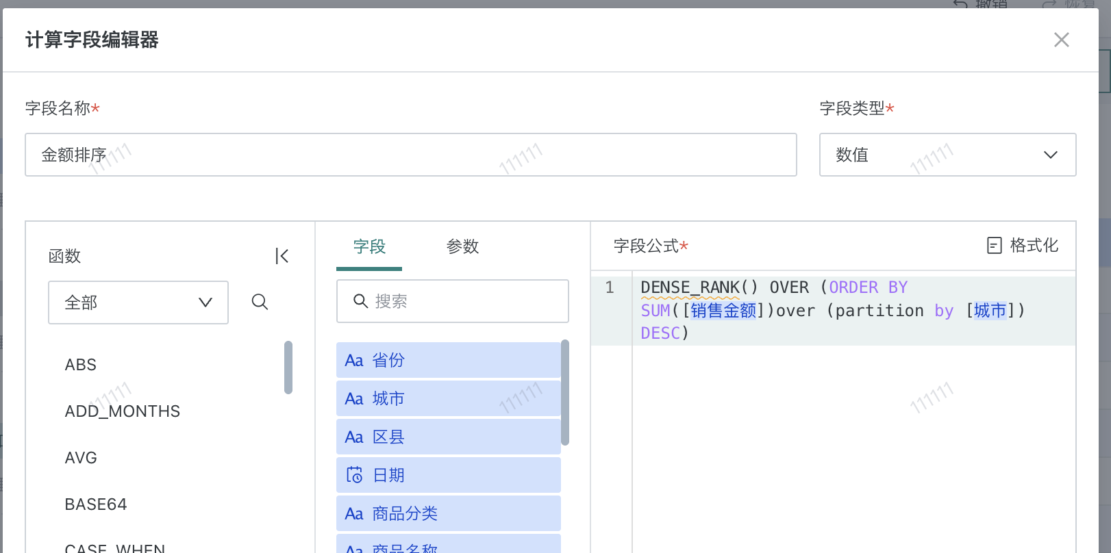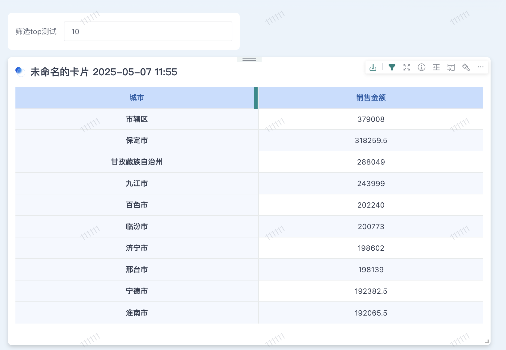 | 可以使用全局参数+新建排序字段来实现。 以下图中的表格为例先在编辑页对字段进行排序: 1、需要先新建一个数值类型的全局参数。 2、然后可以新建开窗字段来对销售金额进行排序; 参考公式:DENSE_RANK() OVER (ORDER BY SUM([销售金额])over (partition by [城市]) DESC) 3、新建一个布尔类型的字段,里面引用全局参数。 参考公式:case when [DYNAMIC_PARAMS.筛选top测试]=0 then [金额排序] <=10 else [金额排序] <=[DYNAMIC_PARAMS.筛选top测试] end 最后将这个字段放到筛选栏,筛选出为ture的值 4、仪表板上新建参数筛选器联动卡片 5、此时当页面筛选10时,就会动态筛选前10名的数据 |