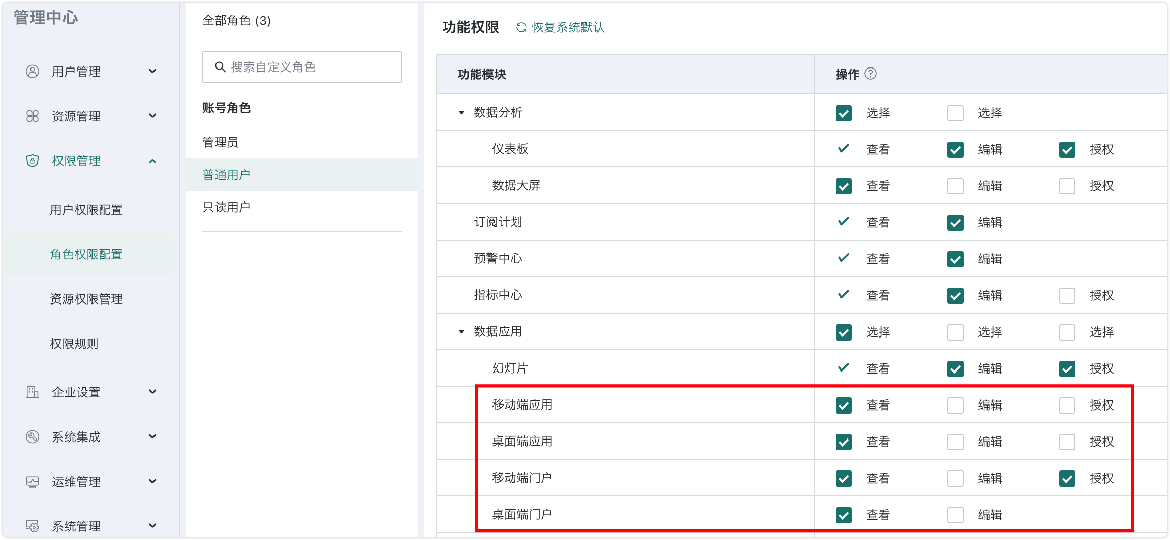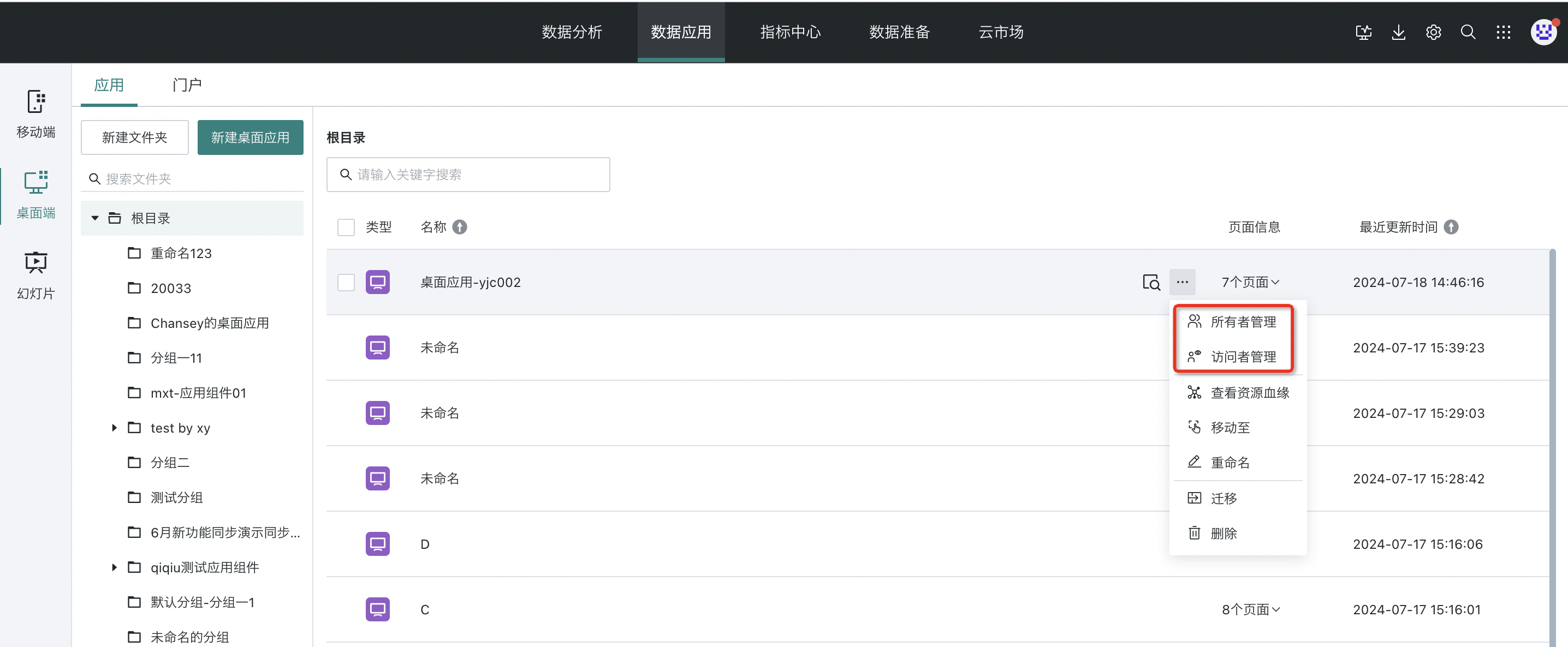 数据应用(应用管理)中设置应用的权限,设置为所有者的话会默认有访问者权限。 单个应用的权限分为所有者和访问者: