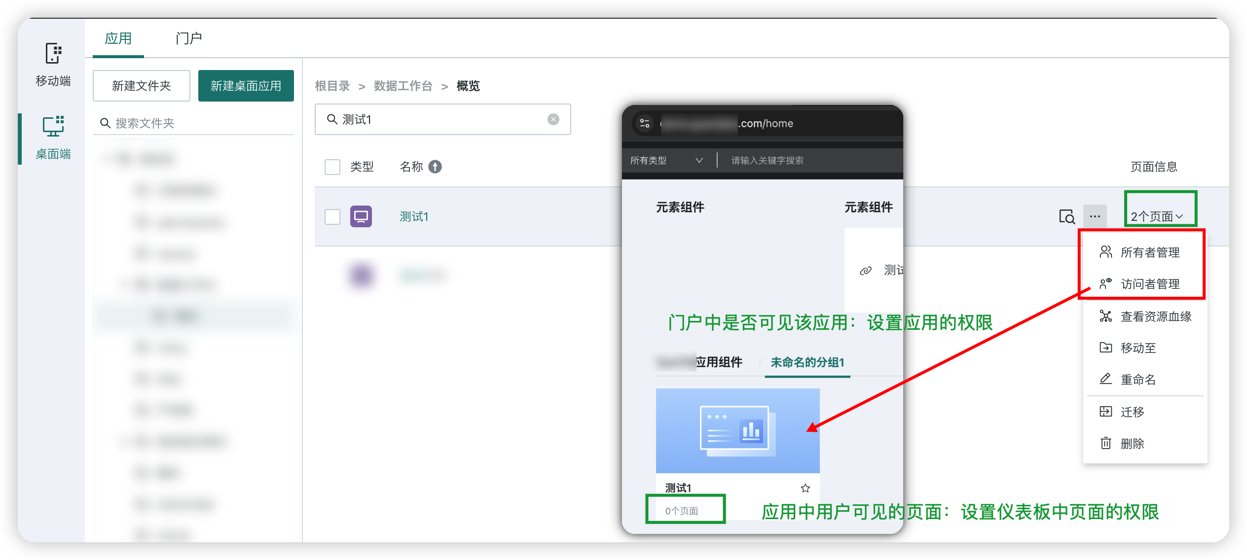 查看:是否能访问到应用和门户的页面,比如桌面端门户是{url}/home,能访问到这个地址 编辑:是否能访问 应用管理 界面,并在其中新建/编辑应用和门户 授权:是否能管理资源的所有者/访问者
