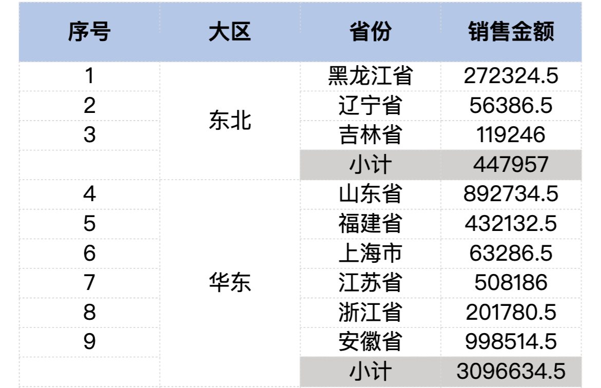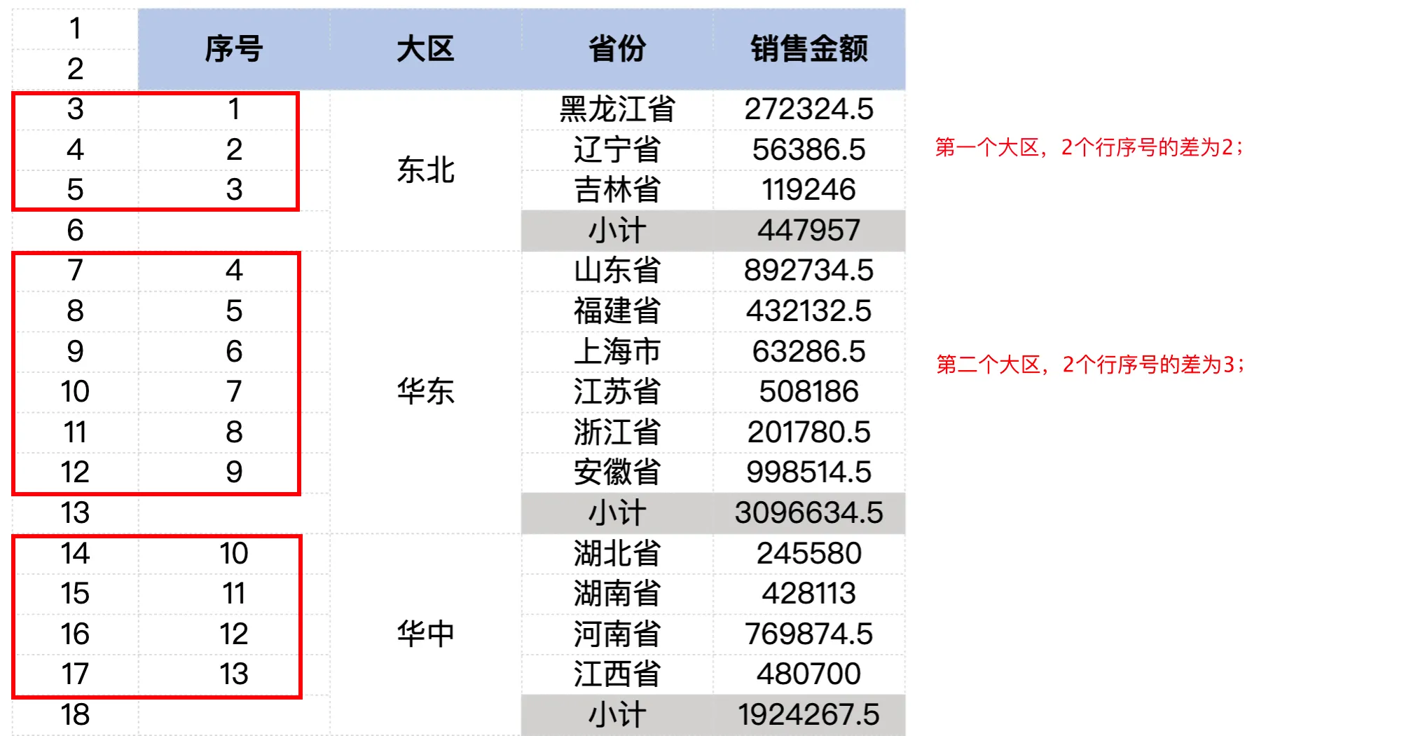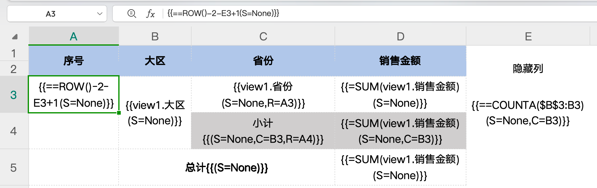 场景一:按数据行添加自增序号实现方案: 思路:表头有1行,可以用当前行行号减一 方案:在维度字段「省份」C2公式里加入R=A2:A2,使用R属性使「序号」的单元格A2成为「省份」C2的子格,序号跟随C2扩展。 场景二:按维度分组,组内自增序号实现方案: 思路:「大区」A2扩展后是合并单元格,合并范围内只有第一个单元格是有值的,其他单元格为空。利用这个逻辑判断:如果A2不为空,则序号为1;如果A2为空,则上一行行号加1。然后取维度字段「省份」C2作为父格即可。 方案:在维度字段「省份」C2公式里加入R=B2:D2,使用R属性使「序号」的单元格B2成为C2的子格,跟随C2扩展。 场景三:按维度分组,分组自增序号实现方案: 思路:「大区」列是合并单元格,序号也需要合并,可以统计大区的值个数来作为序号。 方案:在维度字段「大区」B2里使用R属性R=A2:D2,使序号A2成为B2子格,跟随B2扩展。 场景四:自增序号,但跳过小计行注释: R属性范围内的格间计算、函数公式单元格,一般情况下即使不转换为模板单元格,也会跟随父格动态扩展。 |
