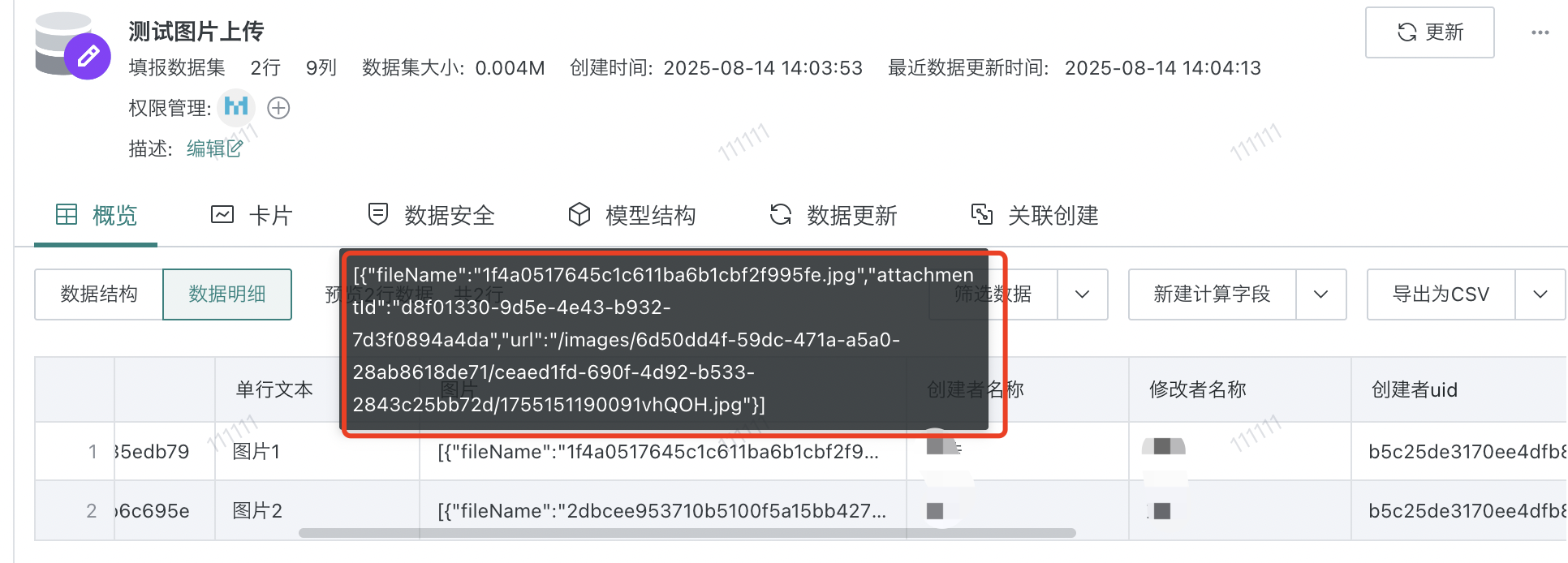 2.生成的填报数据集信息如下,图片变成一个JSON格式文本,无法直接使用展示为图片