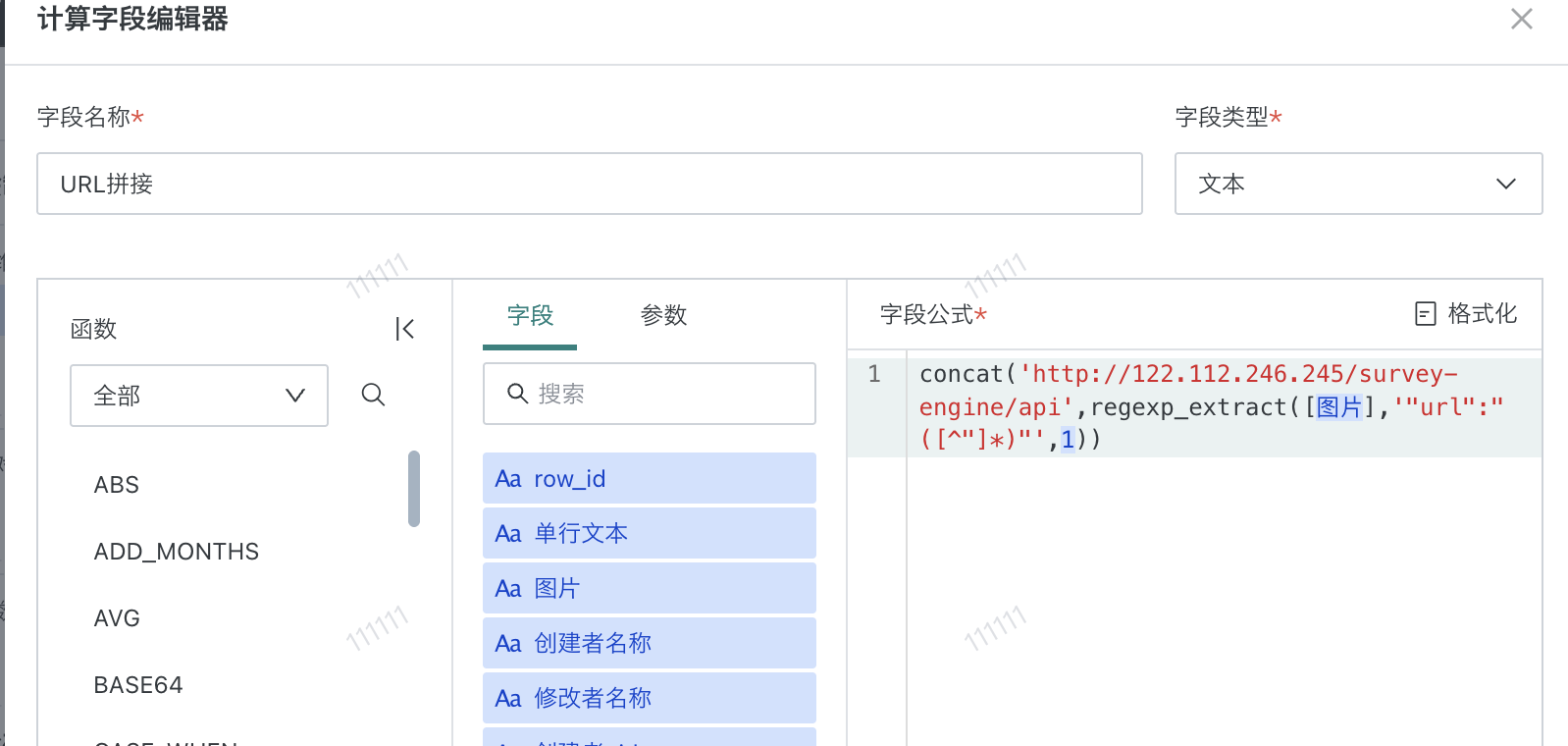 3.图片的URL链接存储在上述图片字段的URL里,我们需要从里面拆分出该字段并拼接上域名或者ip前缀 bi域名或者ip/survey-engine/api