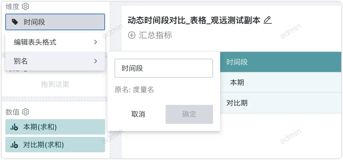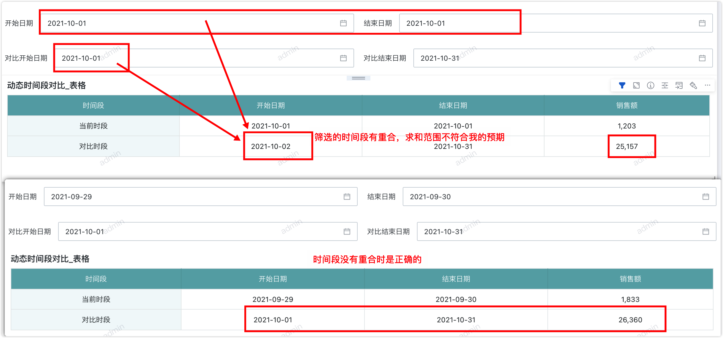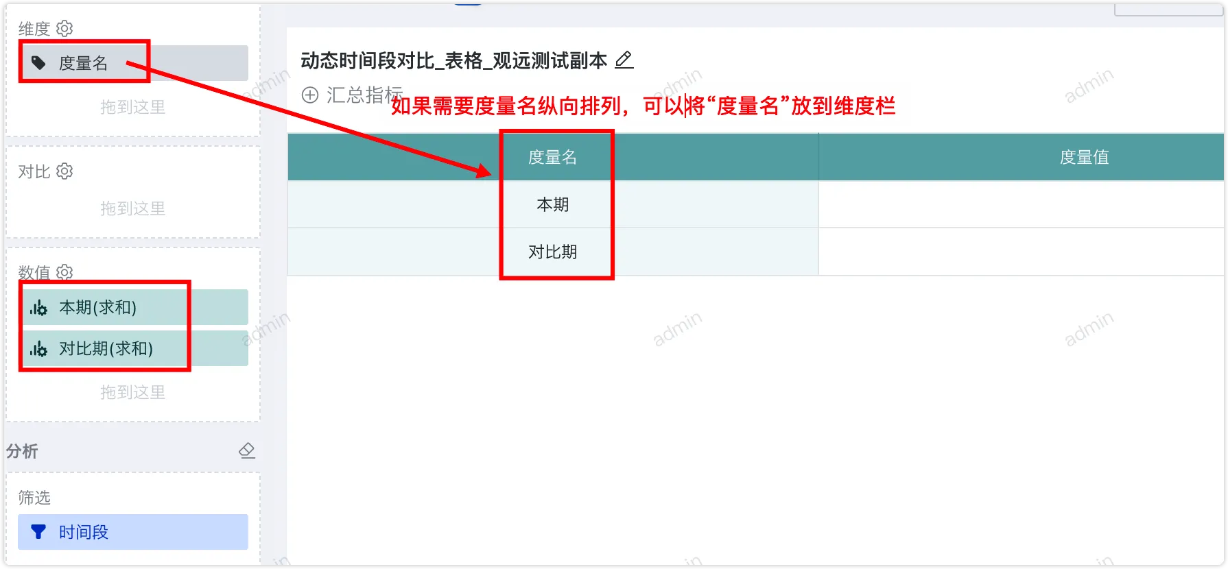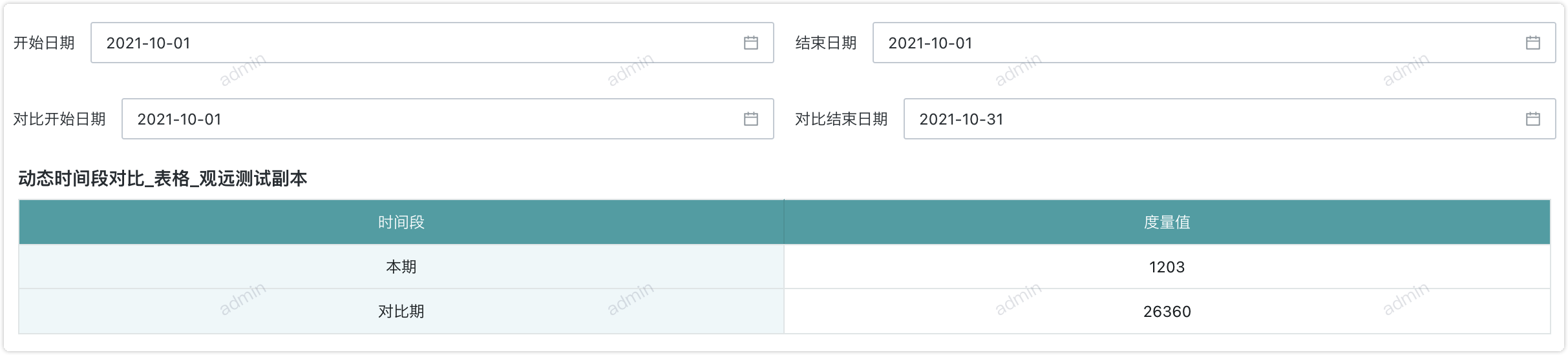 一、背景(一) 场景场景介绍:自由筛选两个时间段内的数据做对比分析。例如筛选一个自由时间段内的数据并汇总计算其销售额;对比另一个自由时间段内的汇总销售额。 (二) 案例观远学堂中有一个案例,是这样实现的: 卡片字段:时间段,字段类型:文本,显示'当前时段'或者'对比时段'。并将该字段用于卡片筛选器中,筛选有效时间段。筛选条件:时间段not null。 (三) 不足但是当两个时间段重合时,对比时段的销售额会缺少和当期重叠的这部分数据 (四) 原因由于上面的实现方式是:对日期进行分组,判断是否在开始结束日期范围内,不满足再判断对比的开始结束日期。由于一行数据里,不能同时既是当前时段又是对比时段,所以对比时段的销售额无法不包含到当前时段的数据,当前这个实现方式无法直接实现需求。 那么如果我希望时间段重合时,也要分别统计到对应的时段里,有什么方式能实现类似的效果吗? 二、实现思路和方案分为两个计算字段,分别只受到本期和对比期的日期参数控制,得到本期和对比期的销售额,之后两个字段都拖入卡片中展示。 之后如果需要度量名纵向排列,可以将“度量名”放到维度栏 同时度量名可以设置别名 三、实现效果两个时间段数据互不影响,能够得到两个时间段内完整的数据。 |