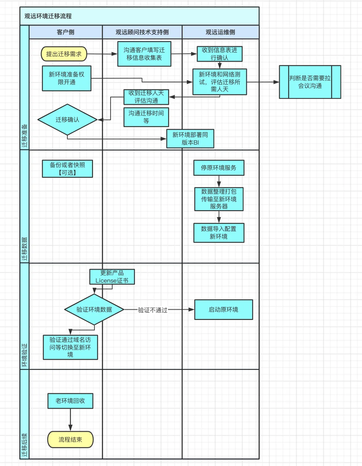 观远提供BI环境整体从当前环境迁移到新环境的增值服务。以下描述主要流程和注意事项。1、主要流程2、特别的注意事项 1、对于客户部署架构发生变化(如本地机房上云、自建K8S到容器化平台等),正式迁移上线前需要进行压测,确保相关资源匹配,网络无限制。 2、数据迁移过程中可能涉及数据外网传输,最好保障临时数据传输速度在10M/s以上。 3、迁移的版本需要和新环境部署的版本保持一致。 4、若要保证迁移数据的完整性,需要在迁移过程中停止服务,因此建议迁移操作时间安排在对业务影响较小的时间段。 5、有的云环境可以提供整机的数据迁移,可以节省时间停机迁移的时间。3、信息收集检查表观远环境迁移信息收集检查表.xlsx如下两个表,表一需要填写,表二无需填写检查确认即可。表一:环境迁移信息收集表客户名称目前环境BI版本原环境环境节点数量新环境环境节点数量原环境部署服务器平台(公有云、IDC机房、容器平台等)新环境部署服务器平台原服务器配置(8c64g等)新服务器配置(是否国产化硬件,性能会受到影响)原环境资源监控/home/guandata数据盘的大小其他说明表二:迁移checklist 事项事件 备注数据中心-数据账户开通数据所需账户的网络端口新服务器能够连接数据库网络(新环境数据账户连接测试成功)数据中心-数据集是否使用其他平台调用更新数据集调用平台需通新服务器地址企业设置-邮件服务是否订阅功能使用邮箱测试命令参考 telnet Smtp.mail.cn 587系统集成-单点登录是否使用单点登录方式单点登录平台配置需测试通过系统集成-钉钉是否使用钉钉登录方式服务端接口 - 钉钉开放平台 登录钉钉后台配置添加新服务器的IP至白名单系统集成-企微是否使用企微登录方式登录企微后台配置添加新服务器的IP至白名单进入应用管理->企业应用->应用 页面,找到对应的应用后进入配置页面,修改【企业可信IP】配置项,把新的IP添加进去,注意需要用分号将多个IP分隔开。云巡检功能是否使用外网云巡检功能需服务器通外网表单填报是否使用填报功能,需确认填报数据是否需要迁移外部部署方式可需要迁移,网络互通后直接对接服务器网络是否可从老服务器传文件至新服务器可选告知网络带宽情况