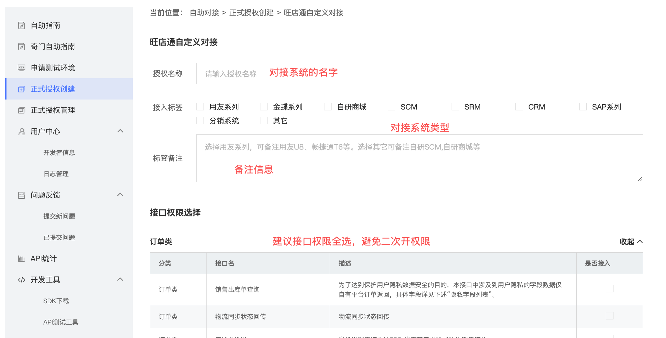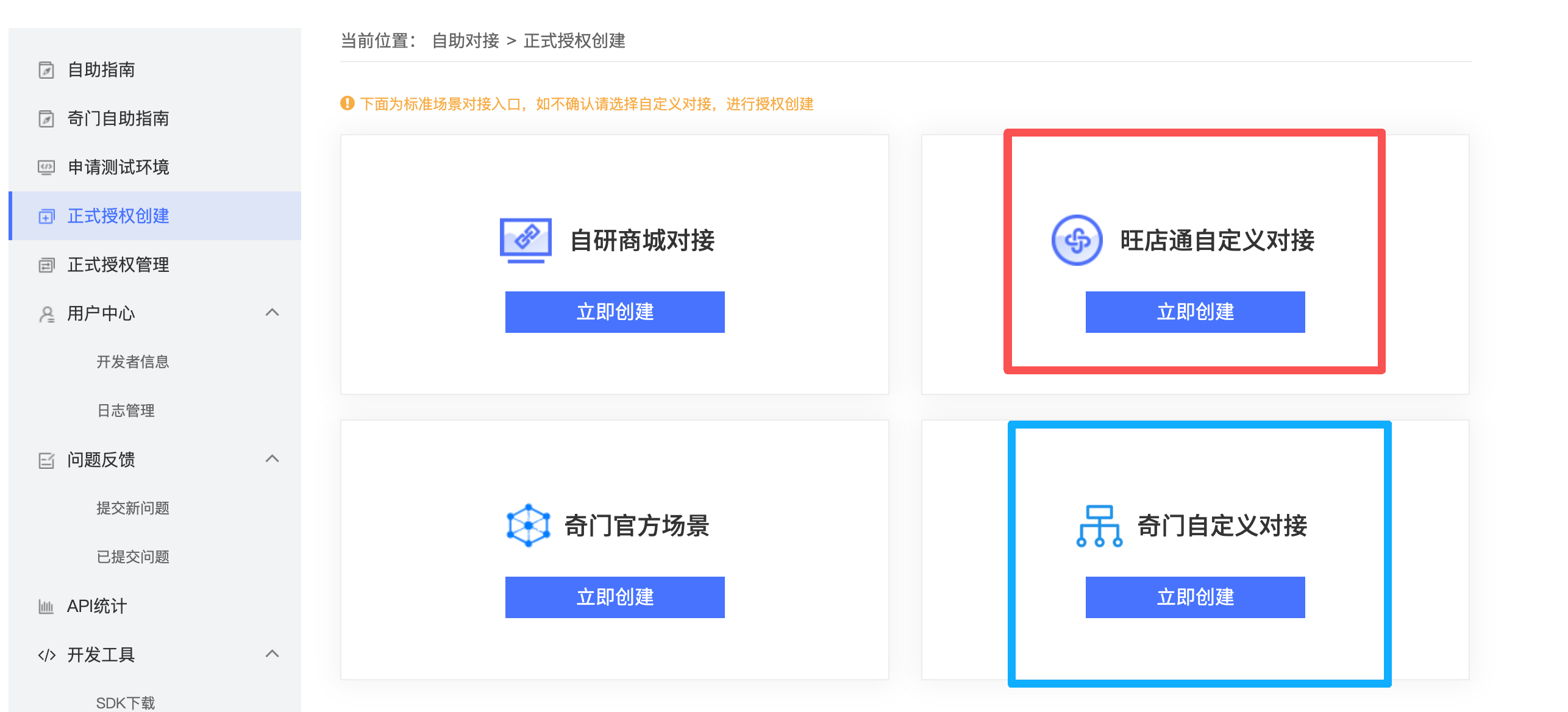此处可选择旺店通自定义对接(对标连接器的非淘系),以及奇门自定义对接(对标连接器的淘系,用于获取淘宝数据)。如果只有淘宝数据需要获取,则优先直接对接奇门自定义(淘系) 2.1 旺店通自定义对接(权限创建)