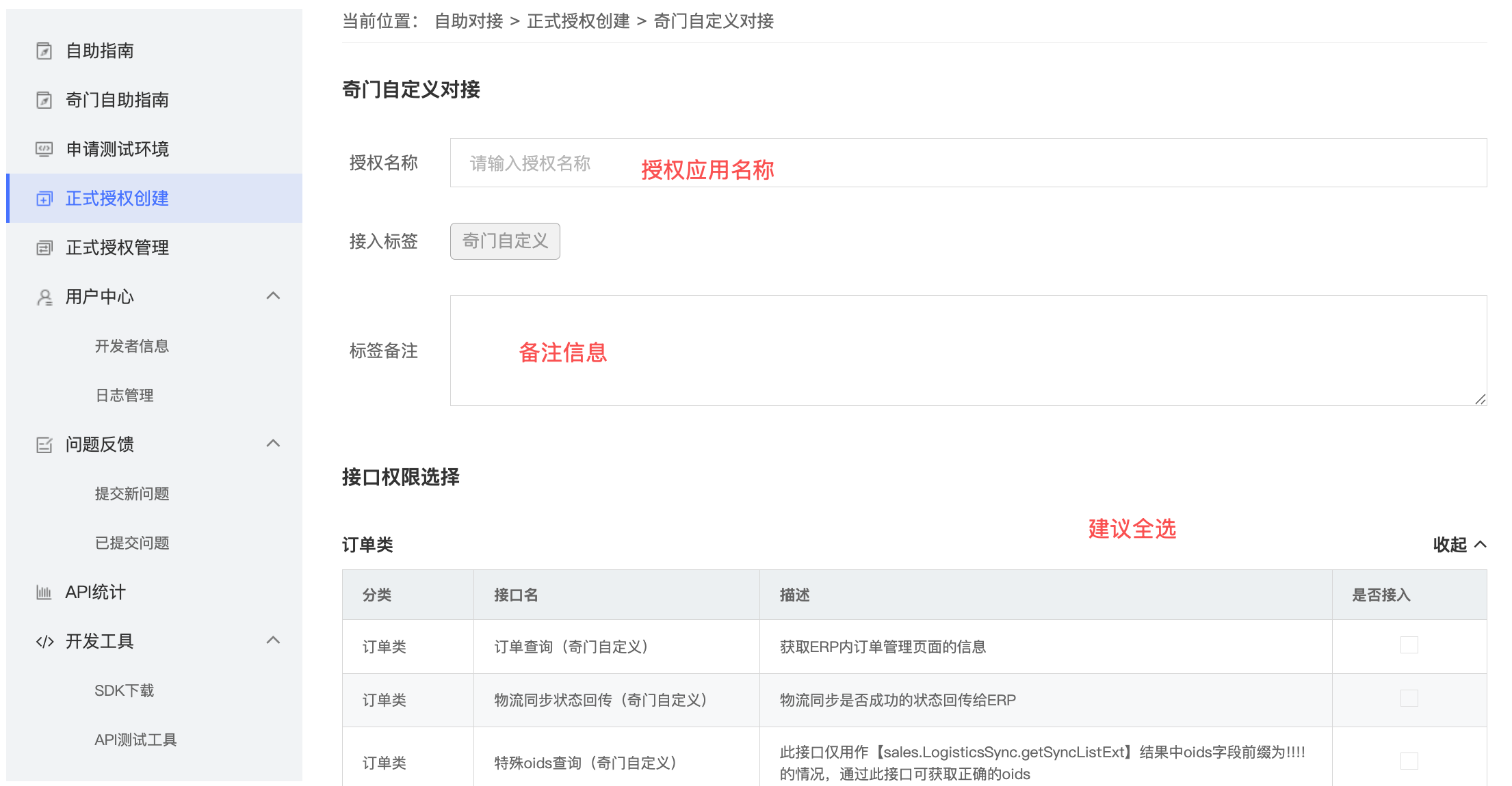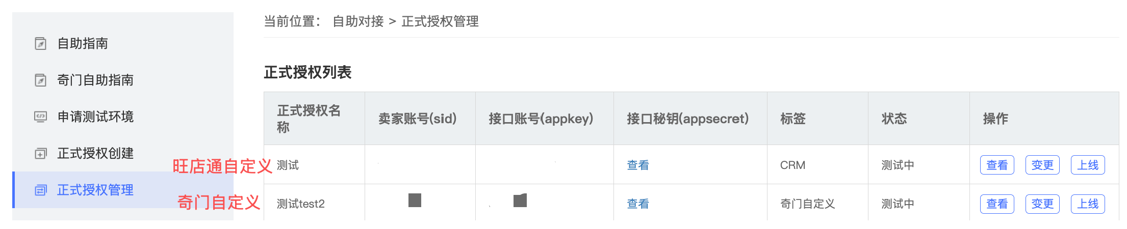 2.3 应用上线上两步分别给旺店通自定义和奇门自定义创建了应用以及选择了接口权限,此时还需要将刚创建的应用进行上线申请,点击正式授权管理