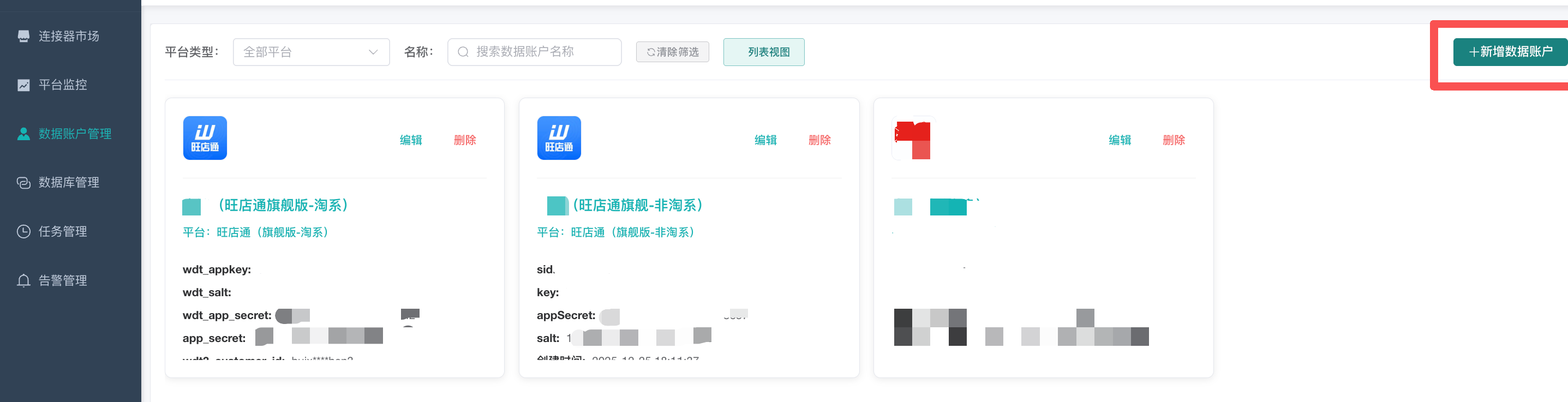 三 新建数据账户同观远数据客服申请所需平台,获取连接器登录账号 登录连接器官网 进入数据账户管理,点击新增数据账户