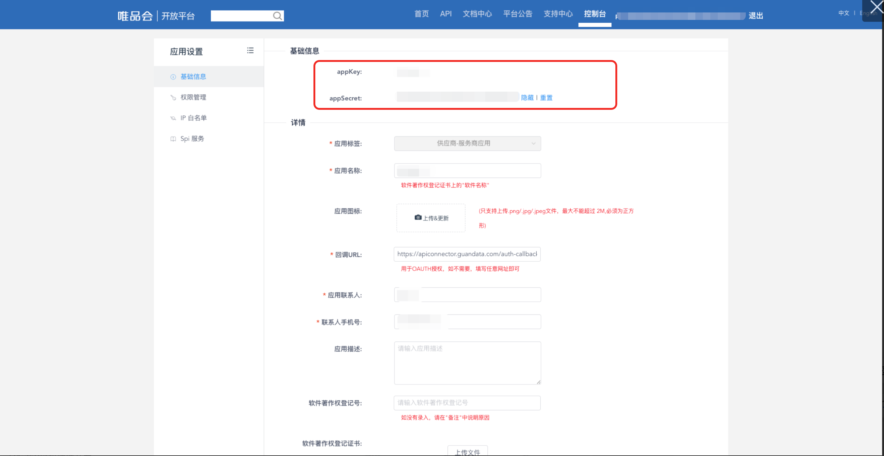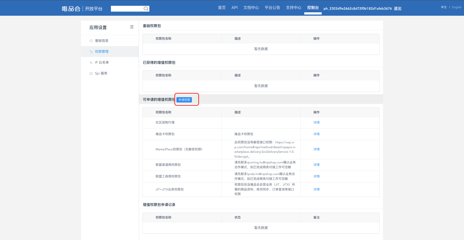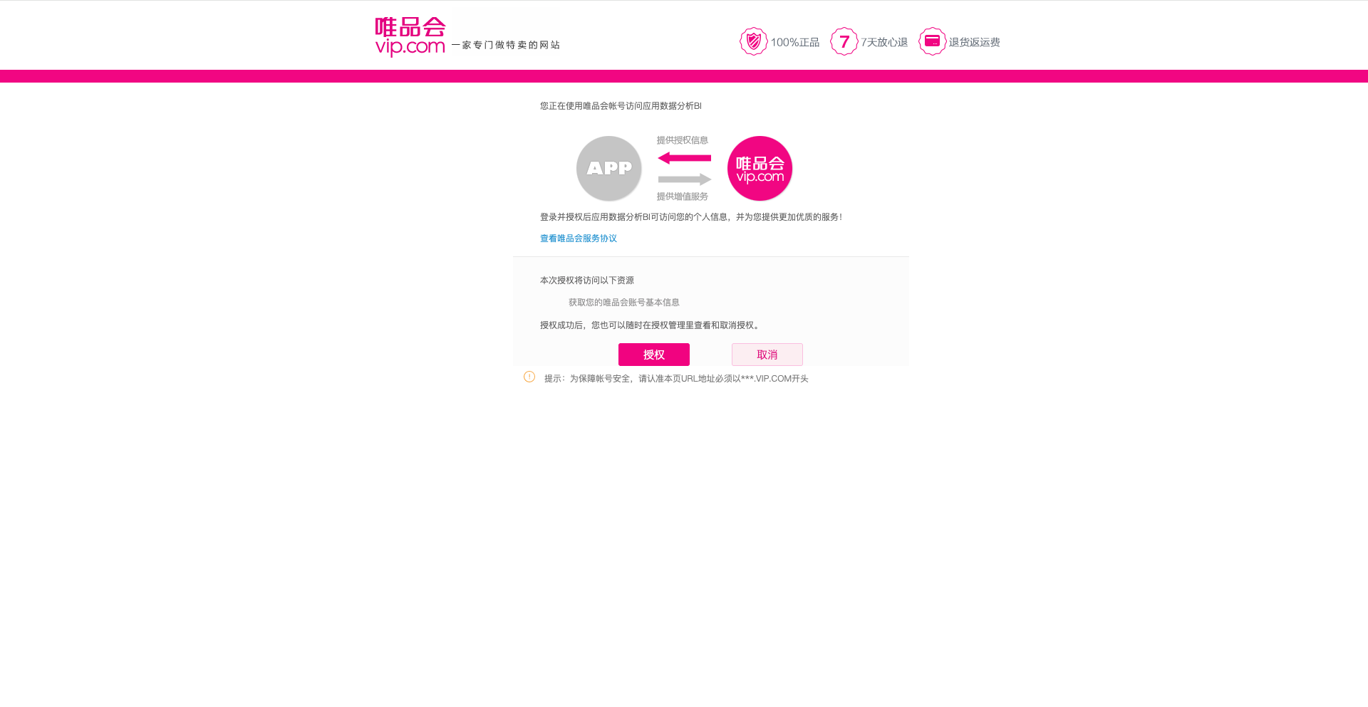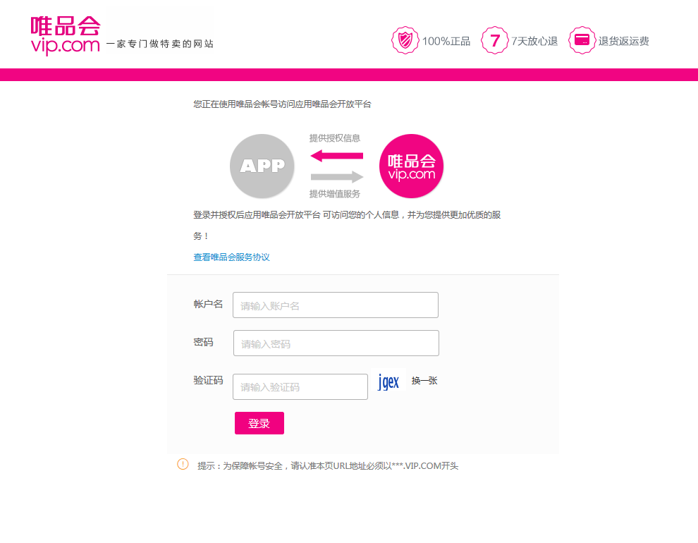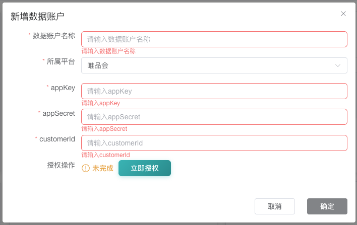 1. 资质申请唯品会业务线分为两条:供应商和MP商家,以账号区别,需客户分别申请资质后才能获取对应接口数据。 1.1. 供应商自研系统1.1.1. 认证供应商官方文档:https://vop.vip.com/doccenter/viewdoc/93 1.1.1.1. 使用主账号登录供应商管理平台(VIS)https://vis.vip.com/login.php 进入供应商管理平台-VOP授权-授权账号 界面 1.1.1.2. VOP授权账号绑定在授权账号界面点击“账号关联” 使用需要绑定的VOP账号(VOP账号就是唯品会APP购物账号)登录 登录完成后,授权账号页面将显示该供应商绑定的唯品会购物账号,请妥善保管账号的密码,OAuth授权的时候需要用到此账号登录进行授权(绑定的账号可以直接用于授权,不需要再在开放平台注册开发者),如遇密码忘记,可通过唯品会APP或唯品会官网进行密码重置。 1.1.1.3. 使用绑定的唯品会购物账号对ISV软件进行OAuth授权绑定账号完成后,您可以对ISV软件进行授权。授权完成,您就可以放心的使用ISV的软件了。 1.1.2. 创建应用官方文档:https://vop.vip.com/doccenter/viewdoc/112 进入唯品会开放平台的控制台(https://vop.vip.com/home#/console/app/overview),找到自研应用,点击【创建应用】按钮。 填写完,申请通过后,点击【我的应用】进入应用,获取到appKey、appSecret。 1.1.3. 权限申请进入应用后点击【权限管理】,点击【申请权限】按钮选择所需要申请的权限包即可。 1.2. MP 商家自研系统官方文档:https://vop.vip.com/doccenter/viewdoc/114 同【供应商自研系统】步骤。 2. AC接入点击左侧【数据账户管理】导航栏,点击【新增数据用户】按钮,在【所属平台】属性中选择唯品会,输入appKey、appSecret,在customerId中输入唯品会账户名(用以区分不同店铺)。 点击【立即授权】按钮跳转到唯品会授权页面。输入账户名、密码、验证码,点击【登录】按钮进入唯品会授权。 点击【授权】按钮。 授权完成时回到AC平台,【立即授权】按钮会变成【已授权】。