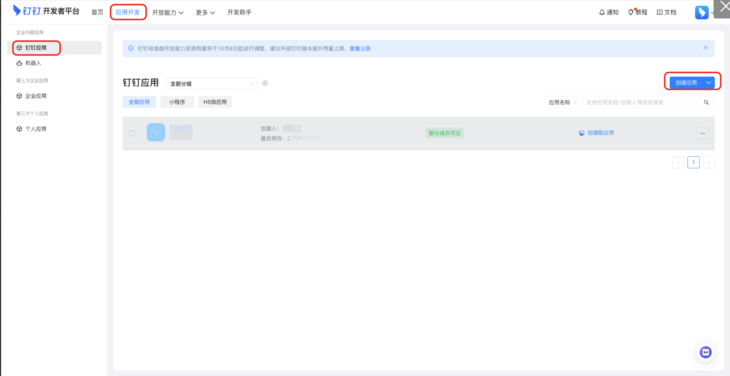 点击【应用开发】,点击【钉钉应用】,点击【创建应用】按钮
