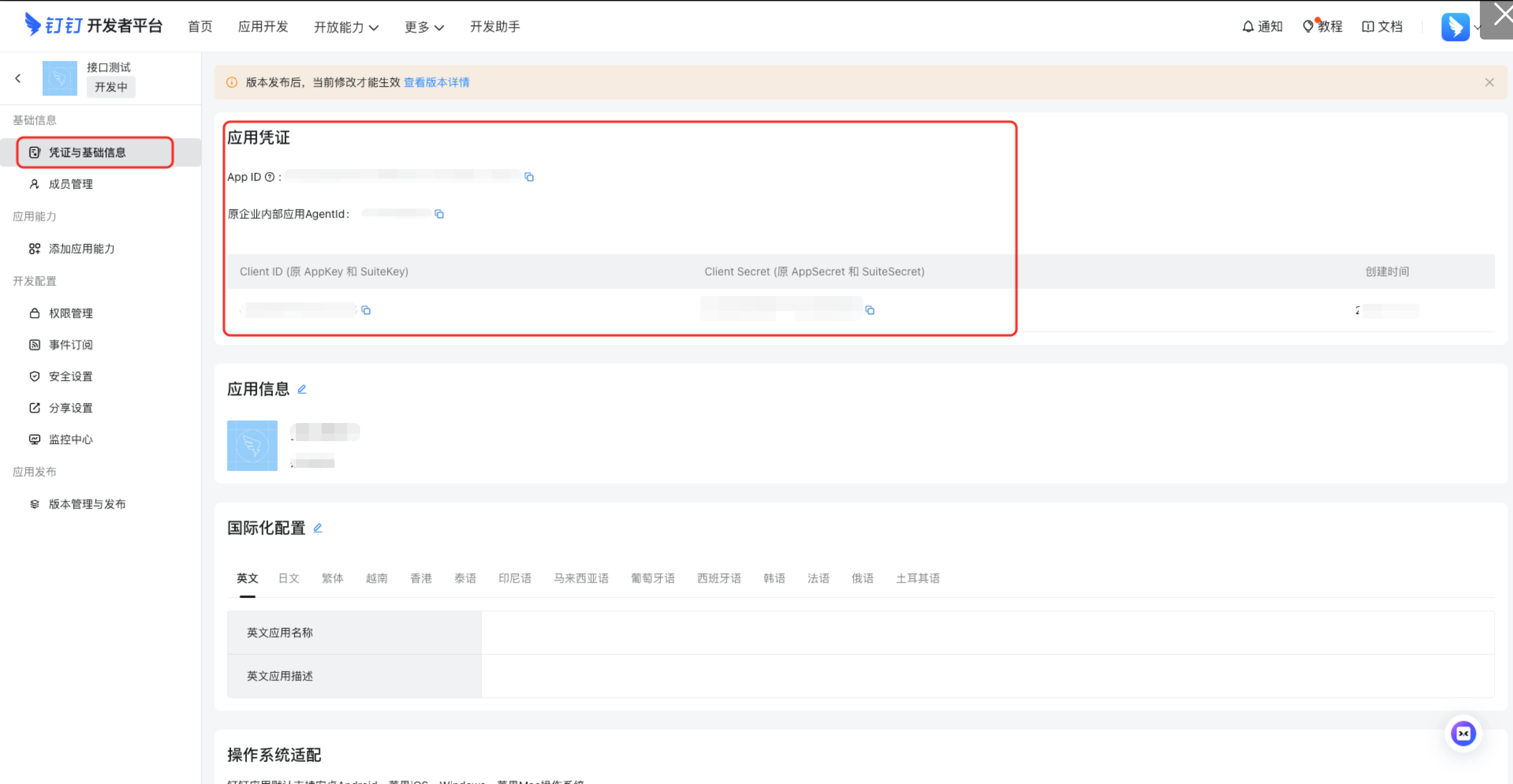 点击【凭证与基础信息】,在【应用凭证】中获取Client ID(AppKey) 和Client Secret(AppSecret)