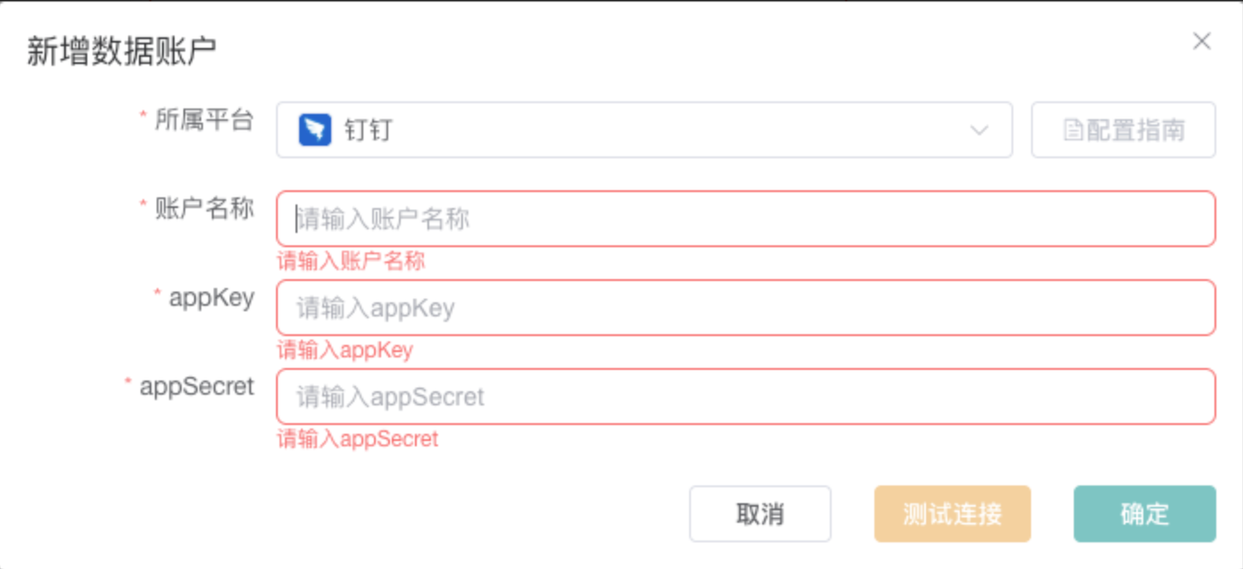 进入连接器平台,进入【数据账户管理】,点击【新增数据账户】按钮,将Client ID(AppKey) 和Client Secret(AppSecret)写入其中,点击【测试连接】按钮返回成功后,点击【确定按钮】完成配置。