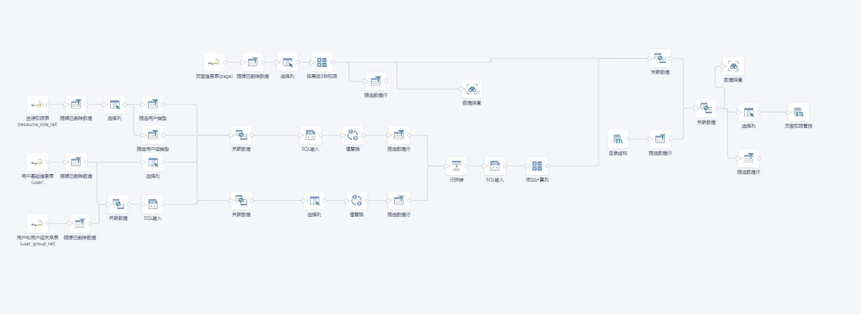前置准备:需要客户申请开通BI元数据库的只读权限。分析云与Saas客户不可开通。客户需要找对应CSM开通。如果无法开通,则无法实现这个方案。 流程简介:1. 开通BI元数据库。开通元数据库的只读权限。 2. 数据集准备:2.1. 接入以下六张表:directory:文件夹目录表,用于处理层级目录。 resource_role_rel:资源权限表,用于查看,每个资源权限分配的用户,以及用户组。 user:用户基础信息表,记录每个用户的ID,姓名等基础信息。 user_group:用户组基础信息表,记录用户组基础信息。 user_group_rel:用户和用户组关系表 page:页面信息表。 3. 数据处理(ETL开发):此步骤,可以用本地数开工具,也可以使用观远的ETL工具。操作步骤可参考如下ETL。