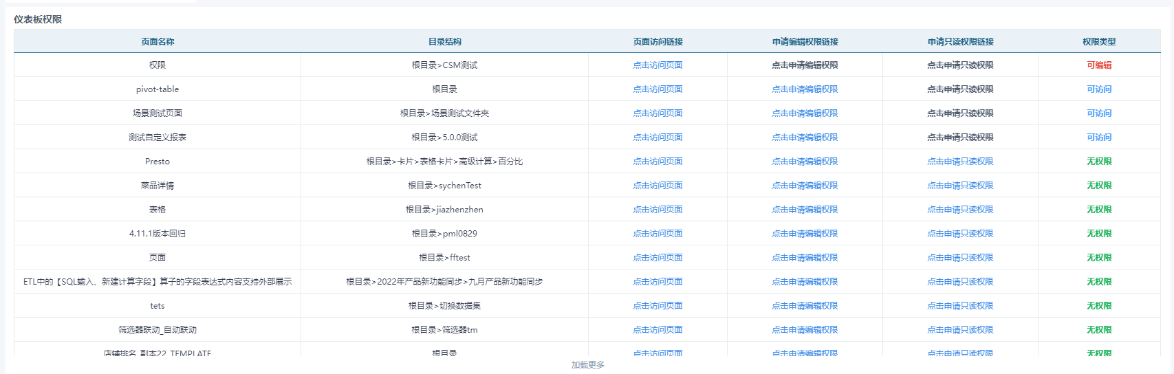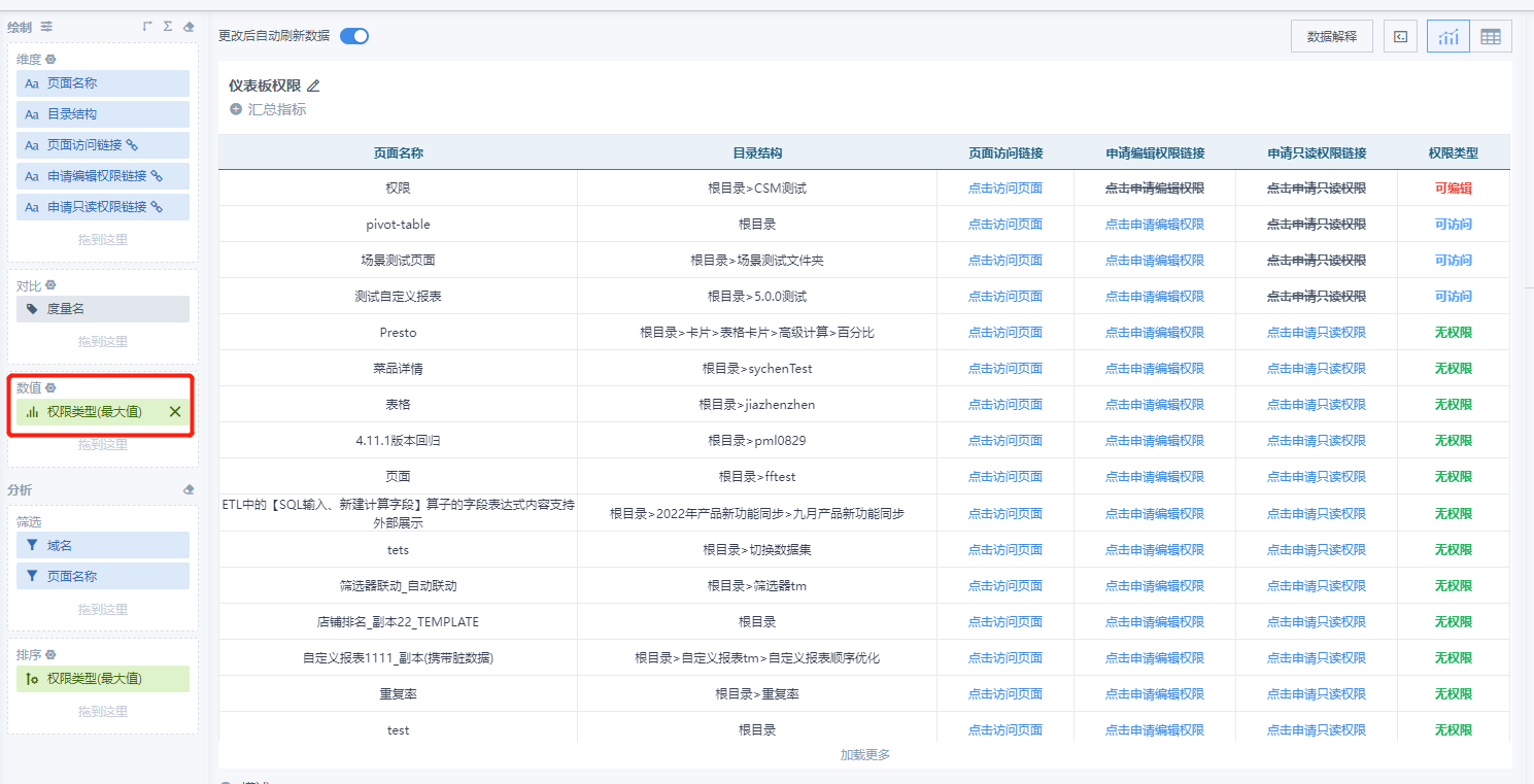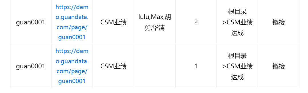 我们提供了ETL处理逻辑,可以导入查看,在ETL导入后替换数据集即可: 目录梳理逻辑:处理目录层级.json 权限数据集处理逻辑:权限模板处理.json 4. 结果数据集设计:按照此逻辑,我们将生成如下结果数据集,每一个页面,都对应3条数据。这里我们拿guan0001这个页面举例: