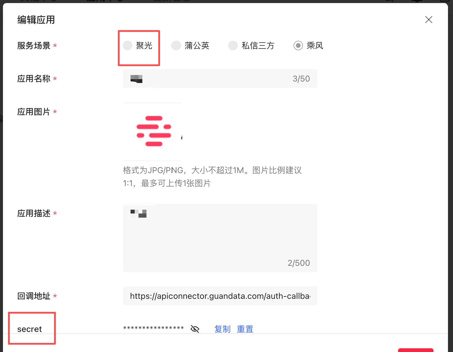 五、开放平台创建应用(聚光和乘风相同)