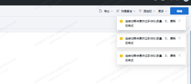 | 一、问题现象 在观远BI使用过程中,当查看页面内容或更新数据集时,可能出现如下报错, 连接池等待请求过多(排队数量X),请稍后再试: 该问题通常表现为:多个卡片同时报错、报错集中在某一时间段、报错卡片所使用数据集多为同一个数据账户、过一会可能会自行恢复正常; 二、问题本质 该问题本质是数据账户连接池资源耗尽导致,在观远BI中,sql查询需要占用数据库连接,但连接池可用连接数量是有限的,当连接全部被占用时,新请求会进入等待队列,当排队数量超过阈值时,就会触发上述报错,因此该问题本质不在前端,大多数时候需要从数据库服务端排查原因。 三、排查链路 建议按照以下顺序进行排查: