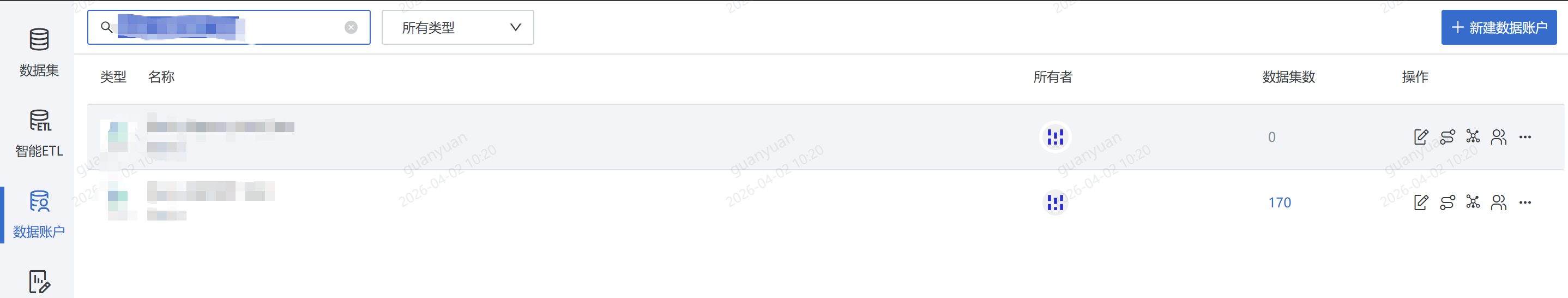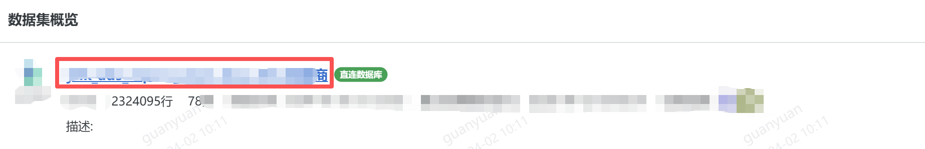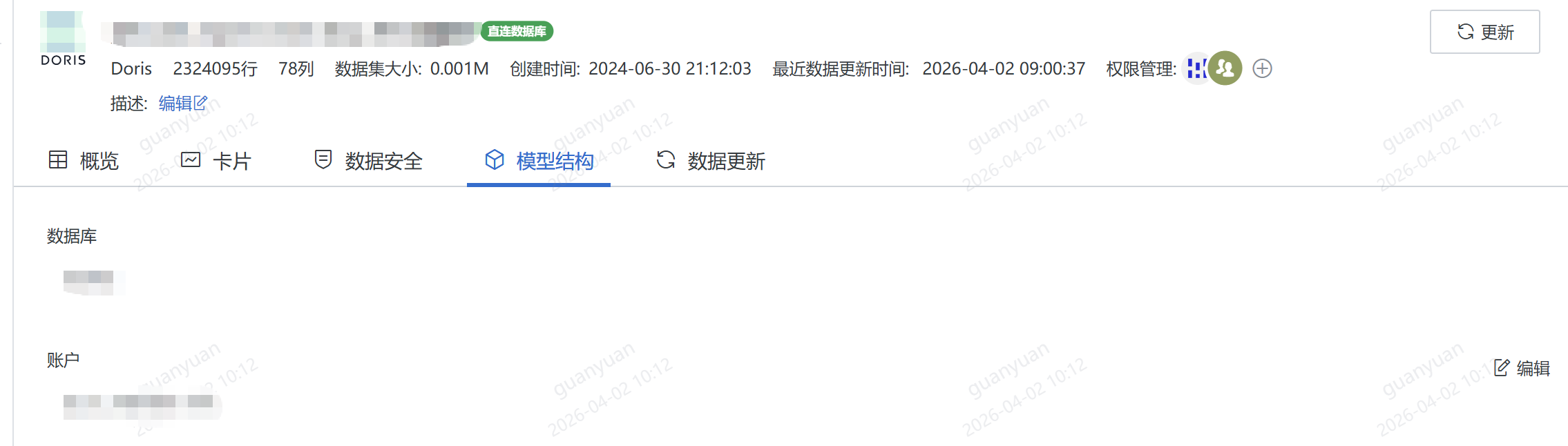 卡片 → 数据集 → 数据账户 → 连接池监控 → 数据库 四、排查步骤 1)定位报错卡片 进入管理中心-运维管理-任务管理-任务明细中,找到失败任务对应卡片, 也可通过仪表板页面上报错弹窗定位报错卡片,需重点确认:是否多个卡片同时失败、报错时间是否集中、如果多个卡片同时异常,基本可以判断为资源问题。 2)通过卡片定位数据集 进入卡片详情页或编辑页,查看卡片所使用的数据集,通过点击数据集名称跳转到数据集详情页, 3)获取数据账户 进入数据集页面,点击模型结构查看数据集所属数据账户名称: 4)定位数据账户 进入数据账户页面,通过名称搜索,