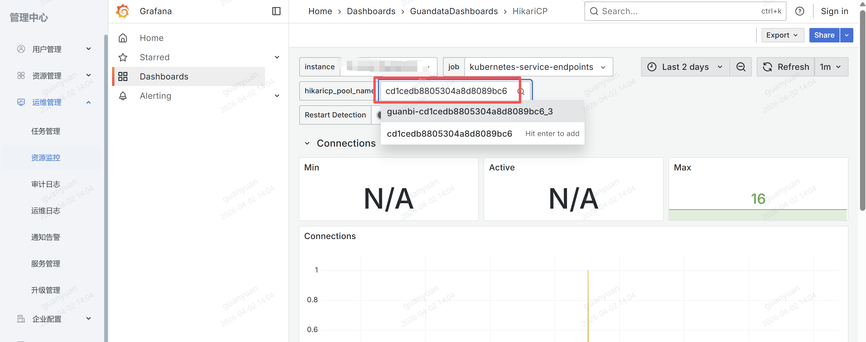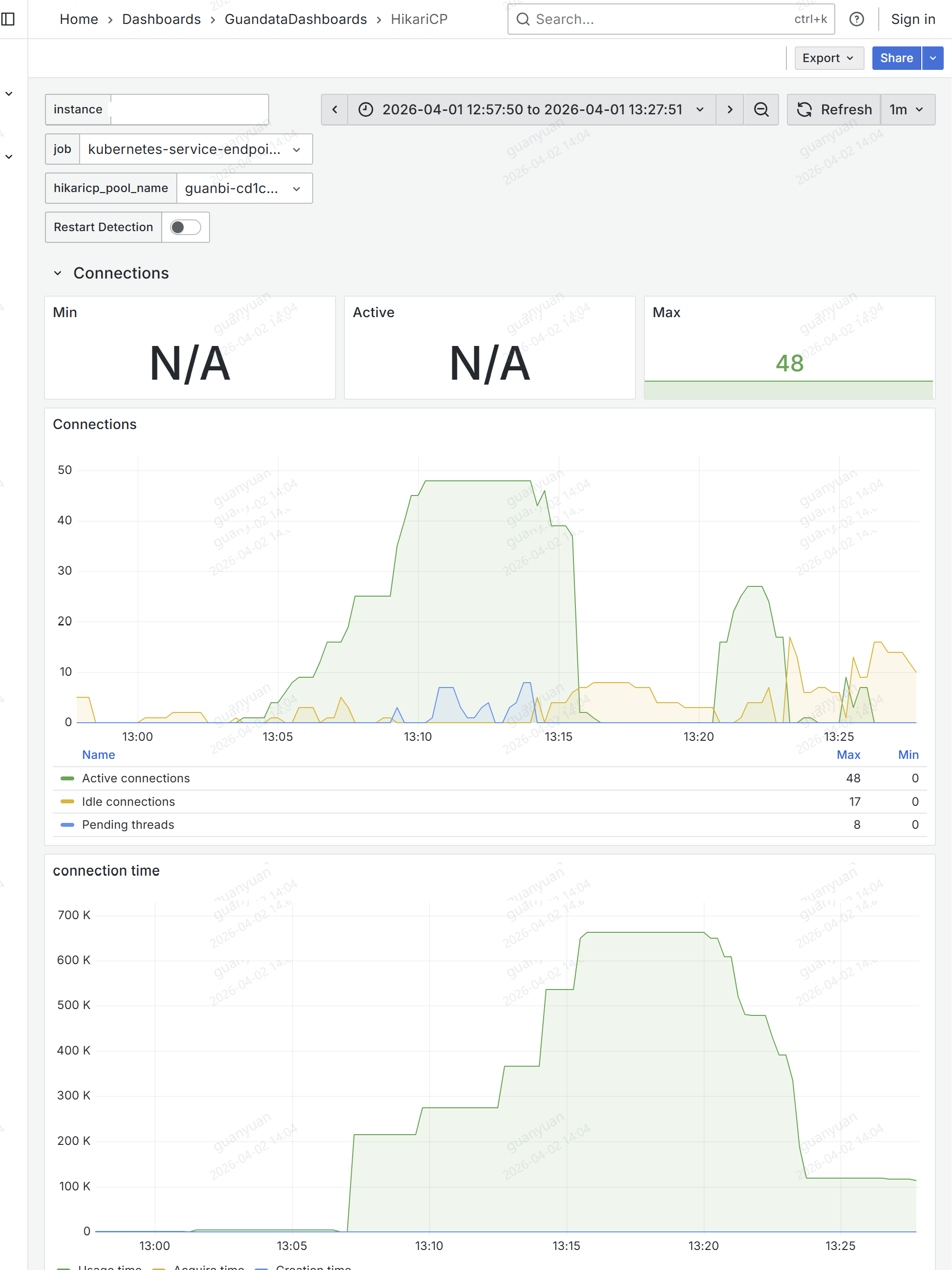 在此之前也许多确认一些报错卡片是否都是指向同一个数据账户。 5)获取数据账户ID 打开浏览器开发者工具,以chrome为例,切换到Network,点击测试连接,查看请求Header中的Request URL, 从URL中可以获取accountId,该ID是连接池监控的唯一标识,复制该ID。若有开通元数据账户也可直接通过数据账户表进行查询。 6)查看连接池监控 进入管理中心-运维管理-资源监控页面中的Dashboards\GuandataDashboards\HikariCP下查看连接池监控,并通过复制的accountId筛选对应账户的连接池监控: 选择卡片频繁报错的时间区间,定位到具体监控信息: 五、监控内容分析 集合上述监控内容可以看到,在13点10分到13点15分: Active connections达到48 说明连接池已经被完全占满,无可用连接数,同时可以看到,connection time明显升高,这说明SQL执行时间变长、连接被长时间占用得不到释放。 六、连接池机制说明 观远BI数据账户连接连接数支持动态扩容。BI7.0及以上版本举例,初始最大连接数(可在数据账户侧进行配置)为32,当满足一定条件时会扩容至1.5倍,也就是32*1.5等于48,因此监控中看到最大连接数为48,当负载降低后 会自动缩容回32; 七、问题结论及解决方案 结合现象与监控数据可以得出,连接池连接数被耗尽是导致卡片报错的直接原因,连接时间升高说明SQL执行变慢,连接得不到及时释放,问题根因在数据库侧,需要排查数据库集群是否存在大量慢sql同时执行、或负载过高性能下降等问题; 除上述数据库侧的排查外, 若该数据账户本身设置的最大连接数较低或为默认值,可以考虑适当调高最大连接数; 卡片侧可以考虑在卡片内增加筛选条件或查询时多增加一些查询条件再进行查询,减小查询数据量; 数据集侧看是否能对数据集数据结构sql进一步优化,另外可以考虑开启开启调度状态,使用缓存,减轻数据库压力,提高查询效率。 |