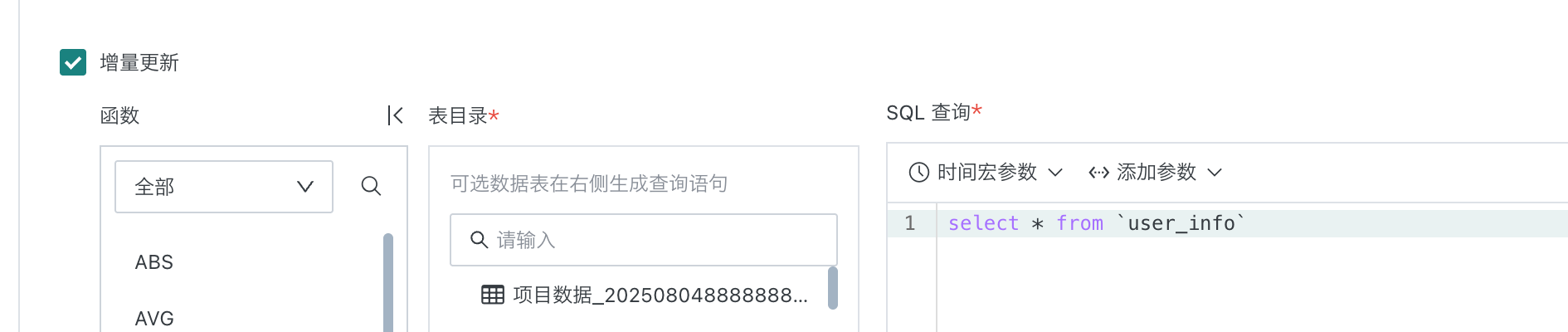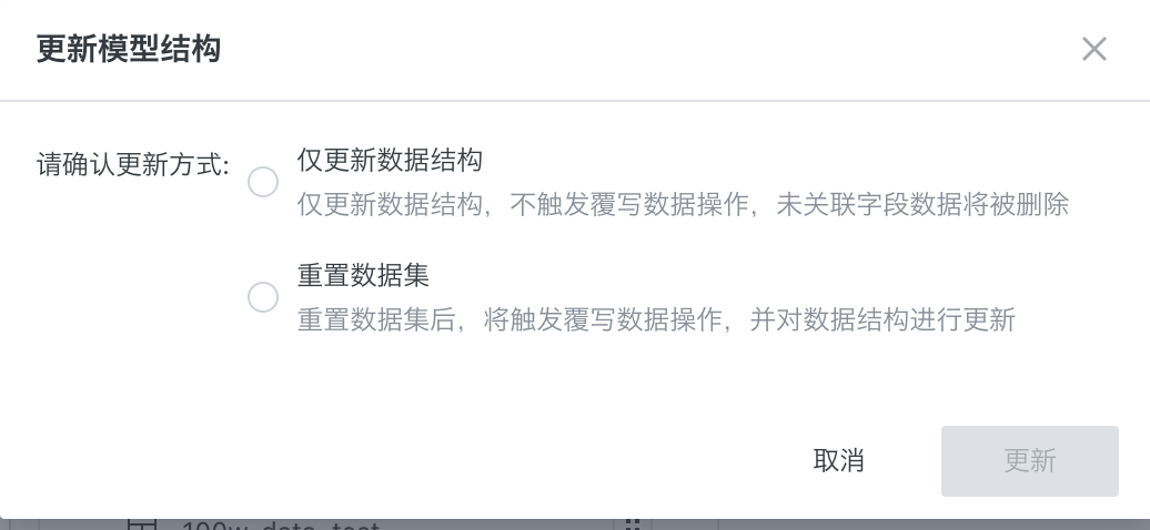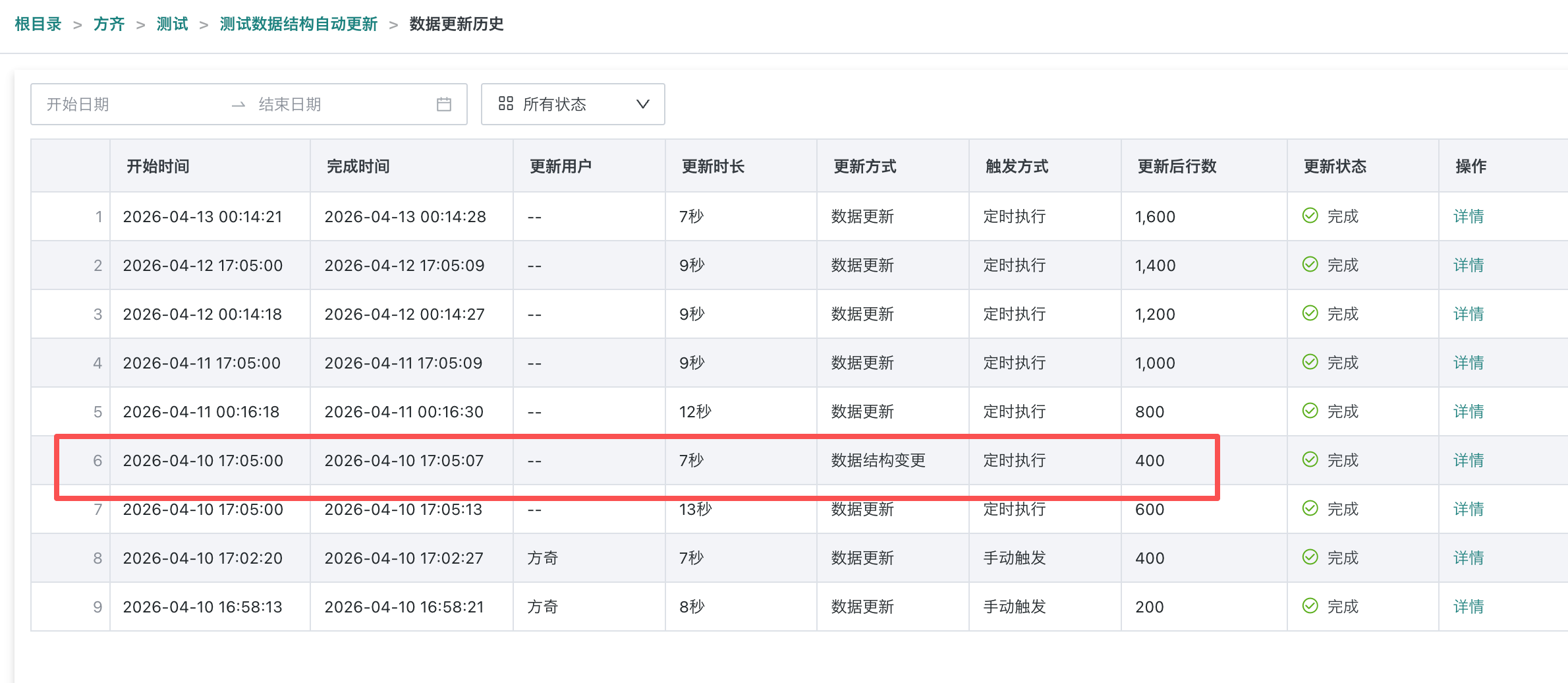 | 抽取数据集如何自动更新数据结构?或者说什么场景下适合使用平台提供的自动更新数据结构的功能还是人工进行数据结构的更新? 一、使用平台提供的自动更新数据结构功能 前提条件: 1、开启增量更新开关,只有开启增量更新后才会出现自动更新数据结构的选项,增量更新功能可参考如下文档内容: https://docs.guandata.com/product/bi/654316178998558720 2、数据集的数据结构、增量更新sql都必须设置为select* xxx ,也就是说“自动更新数据结构”的功能只对select * 这类sql有效,其他规定查询字段的sql无法通过自动方式获取到数据源新增的字段。 3、数据集开启调度状态、设置数据更新周期,当触发数据集更新时会触发数据结构变更的任务,具体可通过数据集的查看更新历史确认: |